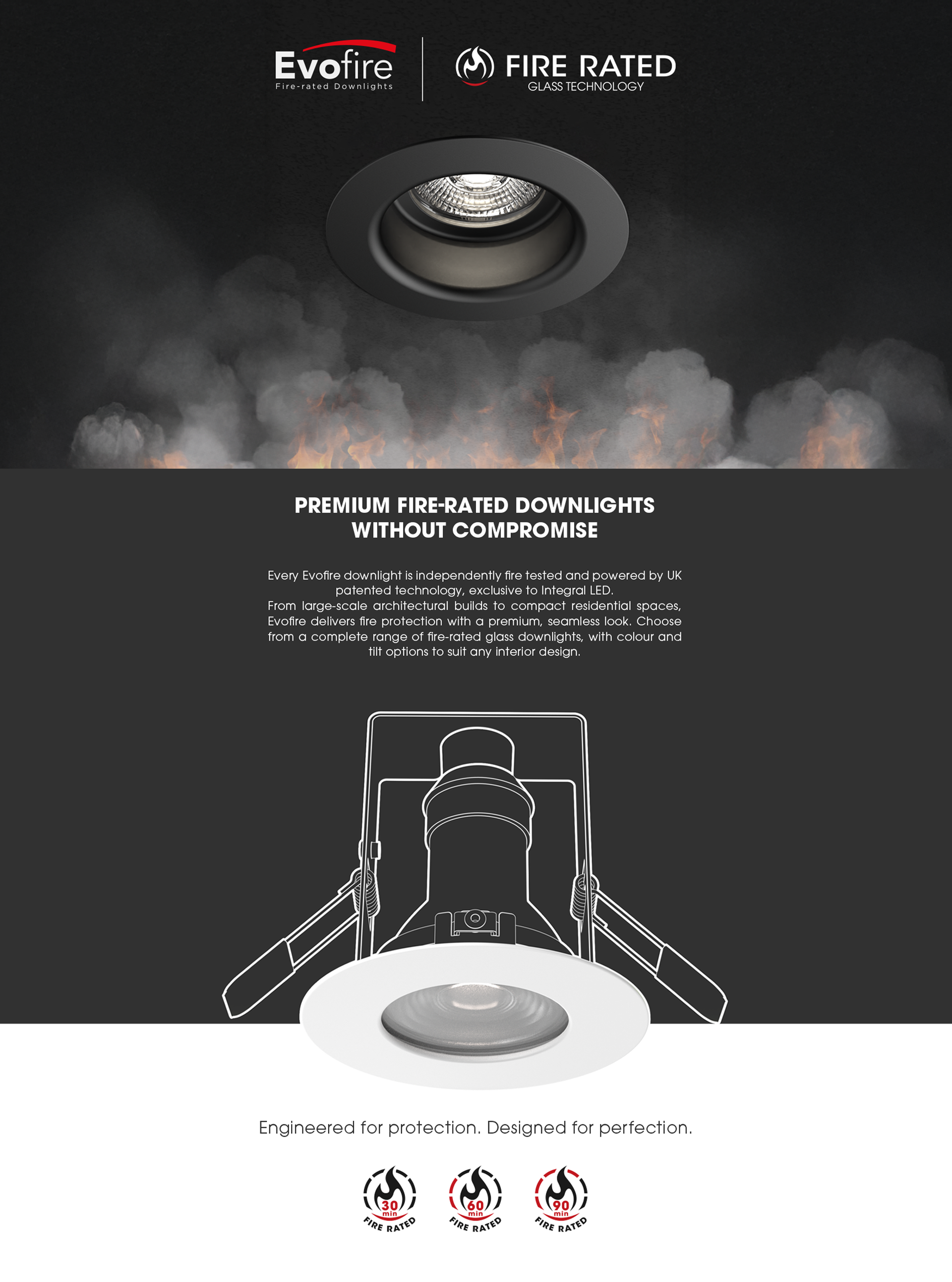 The Evofire is available in a range of colours and finishes, with round and square models available as well as recessed options so the bulb sits higher in the ceiling, reducing glare. Models are available with insulation guards so roof insulation can be safely laid on top of the downlight.