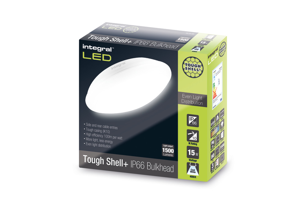 The Integral LED 15W low-energy Tough-Shell+ IP66 Bulkhead has a back-lit LED design that provides a 110 degree beam angle and an even light distribution, available in a black and white finish. This luminaire is suitable for outdoor and indoor installation. Engineered from a super-tough IK10 rated polycarbonate body, it is ideal for external walls in homes, industrial estates and car parks. Indoor uses include walls and ceilings in hallways, stairways and even bathrooms (Zone 1, 2 and 3). This bulkhead delivers 1500 lumens and 4000K white colour temperature. Long life expectancy of 35,000 hours based on normal usage. Each unit is supplied with an easy-to-follow installation guide. This model features side conduit entries and BESA fixing points for added convenience when installing.