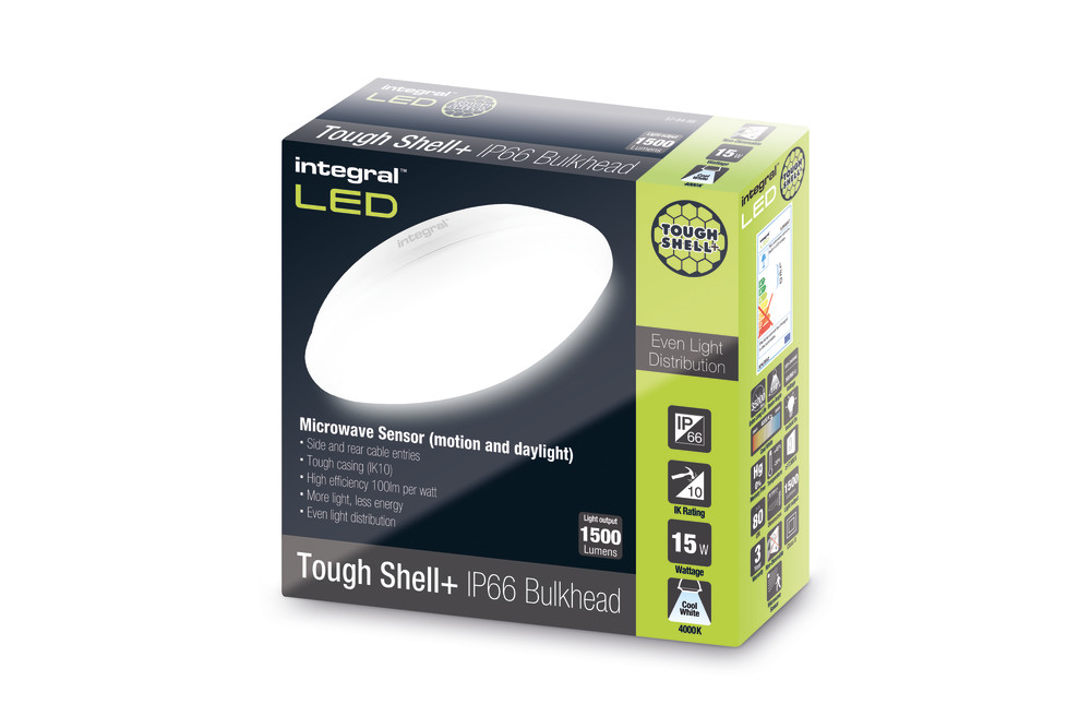TOUGH SHELL+ BULKHEAD MICROWAVE SENSOR 308MM DIA IP66 1500LM 15W 4000K IK10 110 BEAM NON-DIMM WHITE 100LM/W INTEGRAL