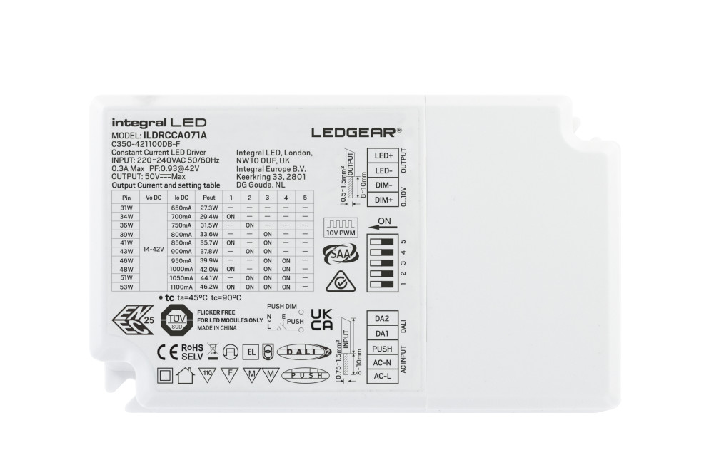 CONSTANT CURRENT DRIVER ADJUSTABLE OUTPUT 31-53W 650-1100MA IP20 DALI - DALI2 - PUSH-DIMM 0-10V DIMMABLE 14-42V OUTPUT INTEGRAL