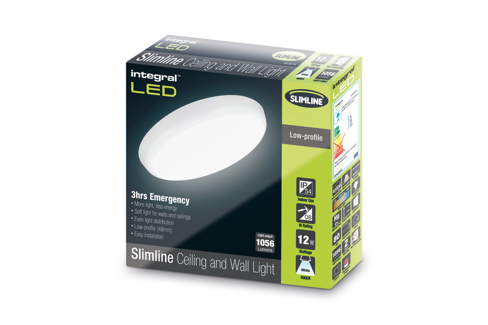 The Integral LED 12W low-energy ceiling and wall light delivers 1056 lumens, 4000K white colour temperature. Its back-lit LED design provides a 120 degree beam angle and an even light distribution. Integral IP54 Slimline ceiling and wall light has a low-profile depth of only 48mm and is suitable for all indoor areas such as hallways, stairways, walls and ceilings including bathrooms (Zone 2 and 3) and covered (sheltered) external areas, such as porches. Engineered from tough, high-grade polycarbonate material. Long life expectancy of 40,000 hours based on normal usage. Each unit is supplied with an easy installation bracket and an easy-to-follow installation guide. Its integrated emergency pack enhances the easy installation and maintenance. Once installed, in the event of a mains power failure the ceiling/wall light will continue delivering light (300 lumen output) for a minimum of 3 hours. A constant green LED light is visible from the front casing to show the emergency mode is functional.