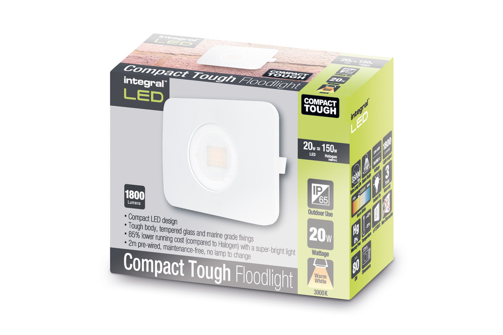 COMPACT TOUGH FLOODLIGHT IP64 1800LM 20W 3000K 110B NON-DIMM 90LM/W WHITE INTEGRAL