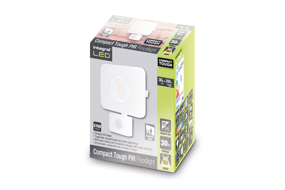 COMPACT TOUGH FLOODLIGHT WITH PIR OVERRIDE IP64 2700LM 30W 3000K 110B NON-DIMM 90LM/W WHITE INTEGRAL