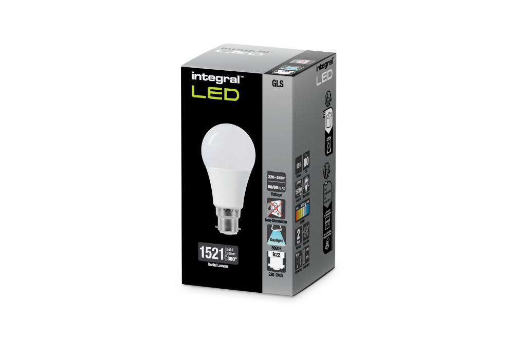 This 13W retro-fit Integral LED Classic Globe (GLS) (large bayonet base) delivers a cool white light and brightness. With a 1521 lumen output, this lamp is one of only a few true 100W filament bulb replacements available today. It features high output LEDs, an anti-glare refractor, all finished in an aluminium and plastic, thermally efficient body. Ideal for rooms with a single pendant fitting, living rooms, hallways and kitchens.