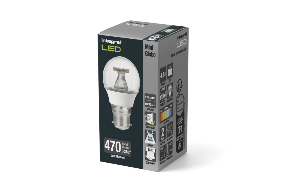 This 4.9W retro-fit Integral LED Mini Globe (large bayonet base) delivers a warm light and brightness, similar to a 40W filament bulb. It features high output LEDs and an anti-glare refractor. Ideal for living rooms, dining rooms and bedrooms, in classic or modern wall or floor/table lamp fittings.
