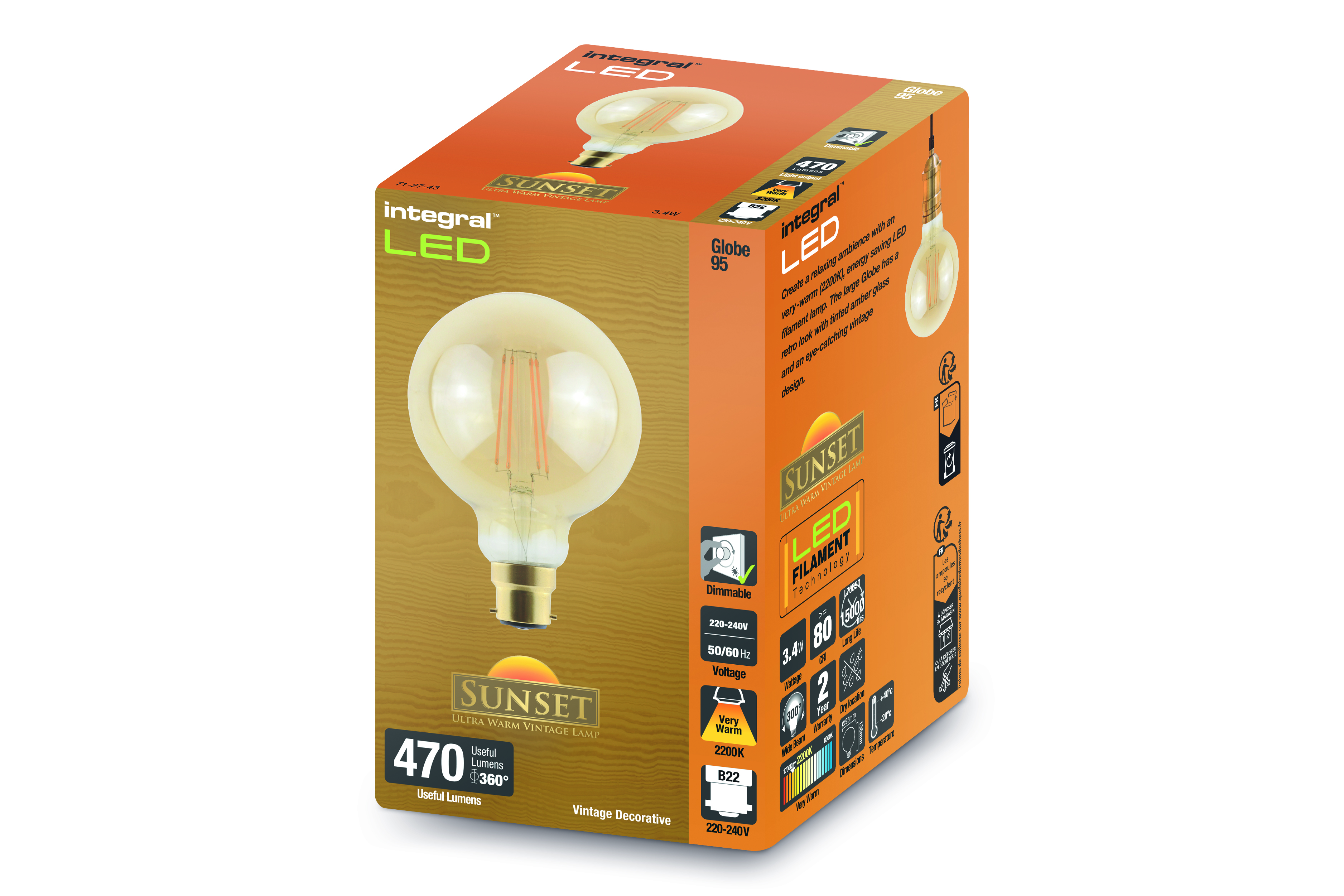 SUNSET VINTAGE FILAMENT GLOBE G95 BULB B22 470LM 3.4W 2200K DIMMABLE 300 BEAM AMBER INTEGRAL