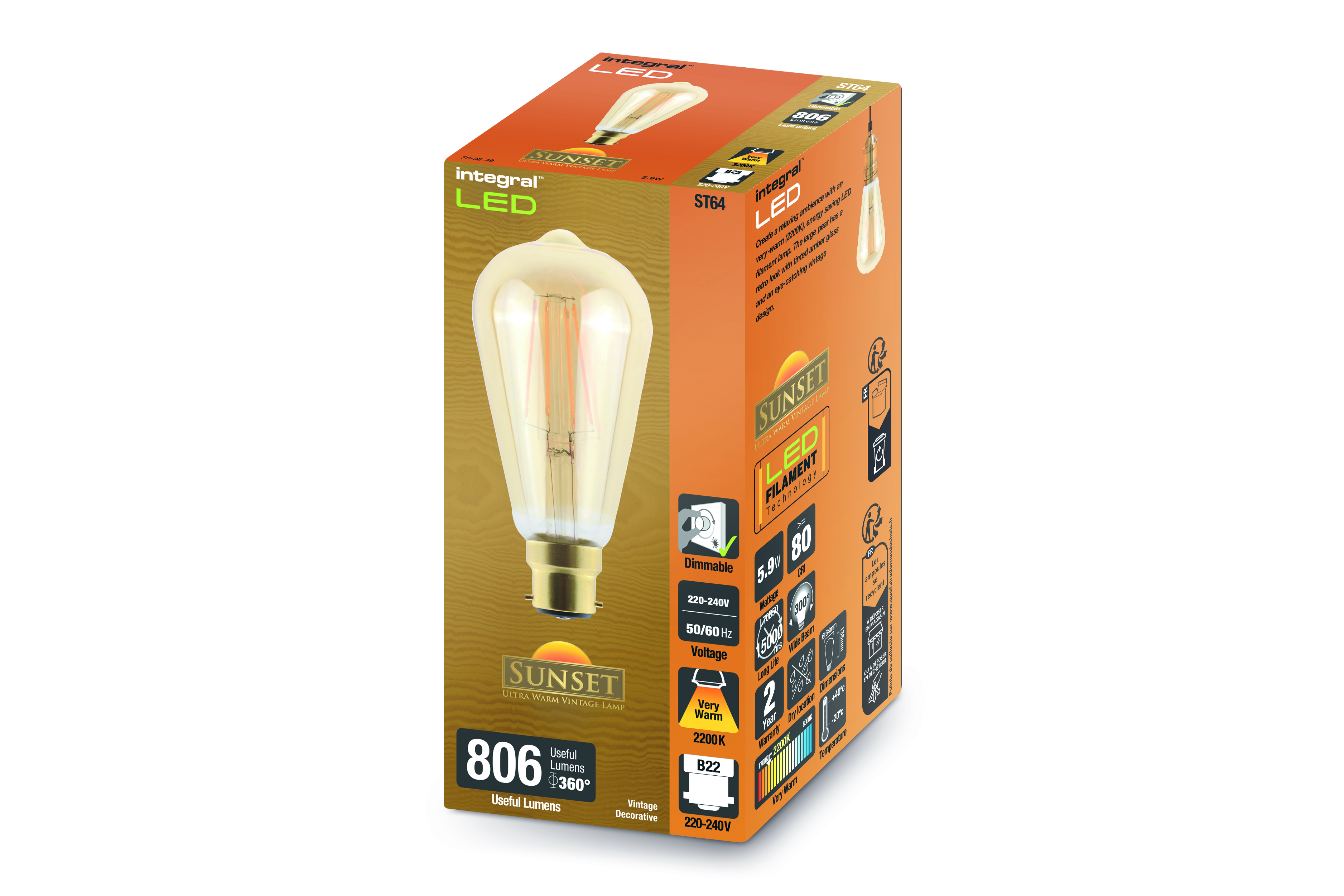 SUNSET VINTAGE FILAMENT ST64 BULB B22 806LM 5.9W 2200K DIMMABLE 300 BEAM AMBER INTEGRAL