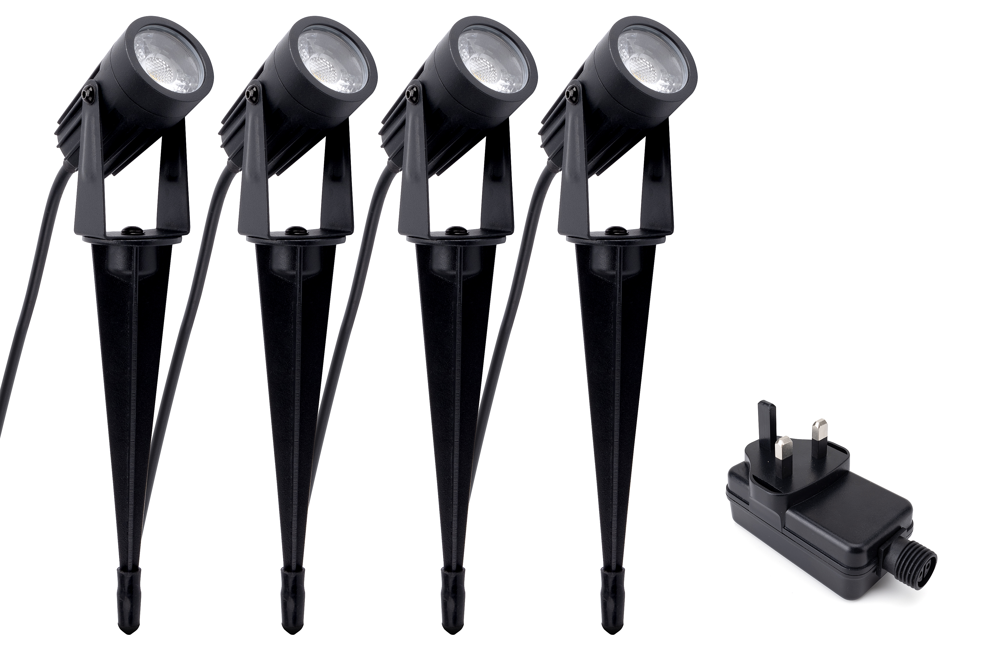OUTDOOR 12V SPIKE SPOTLIGHT 4PCS SET IP65 240LM 3W EACH 3000K WITH IP20 UK PLUG INTEGRAL