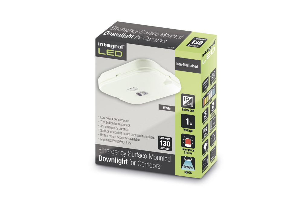SURFACE EMERGENCY DOWNLIGHT IP44 130LM 1W 6000K 3HR NON-MAINTAINED CORRIDOR TEST BUTTON INTEGRAL