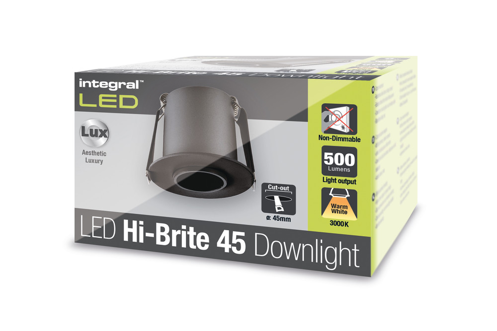 HI-BRITE DOWNLIGHT 45MM CUTOUT 9W 500LM 58LM/W 3000K 30 BEAM NON-DIMM FINISH-A BLACK INTEGRAL