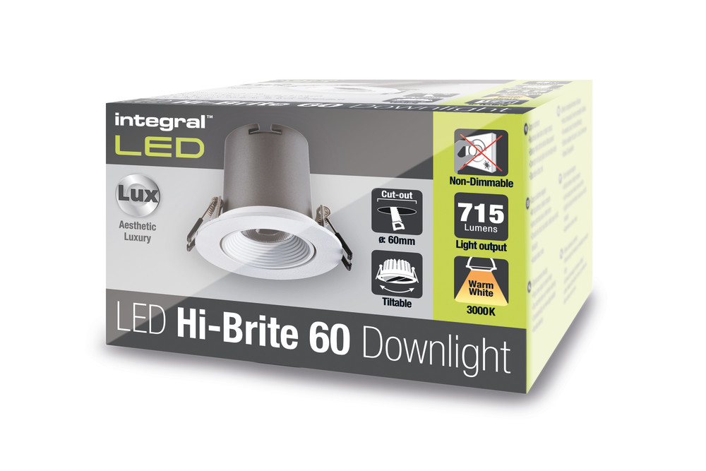 HI-BRITE TILTABLE DOWNLIGHT 60MM CUTOUT 9W 715LM 82LM/W 3000K 30 BEAM NON-DIMM FINISH-F WHITE INTEGRAL