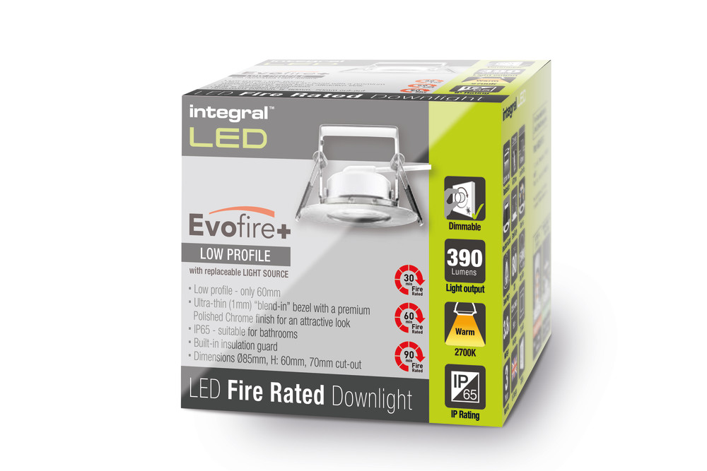Ideal for tight spaces - Only 60mm high with a built-in insulation guard and replaceable lamp (Evolight).Attractive look in any room - Ultra-thin 1mm blend-in bezel with a premium finish.Easy wiring - with a 28cm cable and Fast-Fit, loop-in/loop-out, junction box for tool-free assembly.Easy to install and remove - Lightweight steel body, only 172g.Extended lamp life - Open design allows airflow to extend lamp life compared to traditional designs.70mm Cut-Out, 85mm Diameter, IP65, Dimmable.This downlight is fire rated to 30, 60 and 90 minutes in compliance with BS476 Part 21:1987, Air Tightness compliant with Part C and Part L and Resistance to Sound compliant with Part E. See installation guide for full details.