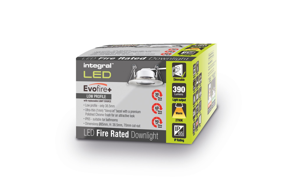 EVOFIRE+ FRDL 70MM CUTOUT IP65 390LM 3.8W 2700K 36 BEAM DIMMABLE 102LM/W POLISHED CHROME ROUND INTEGRAL