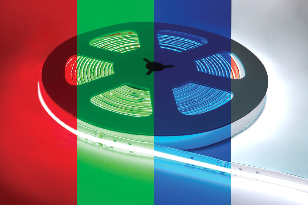 COB HIGH UNIFORMITY PRO STRIP IP65 5M PACK RGB+W 4000K 24V 15W/M 1344LED/M 12MM WIDTH BUILT-IN STEEL LINING INTEGRAL