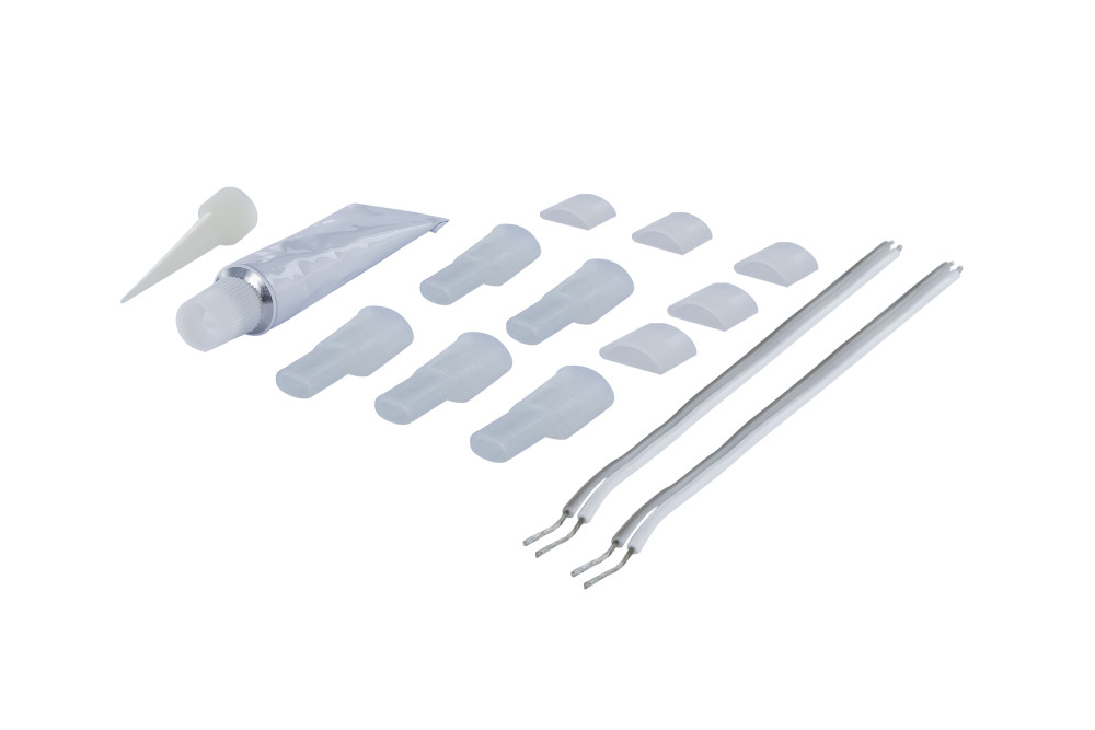 IP65 Kit - 5 x Pierced end caps, 5 x Sealed end caps, 2 x Sets of 150mm power cables and a Silicone tube for use with 8mm width IP65 Single Colour High Uniformity LED strips.