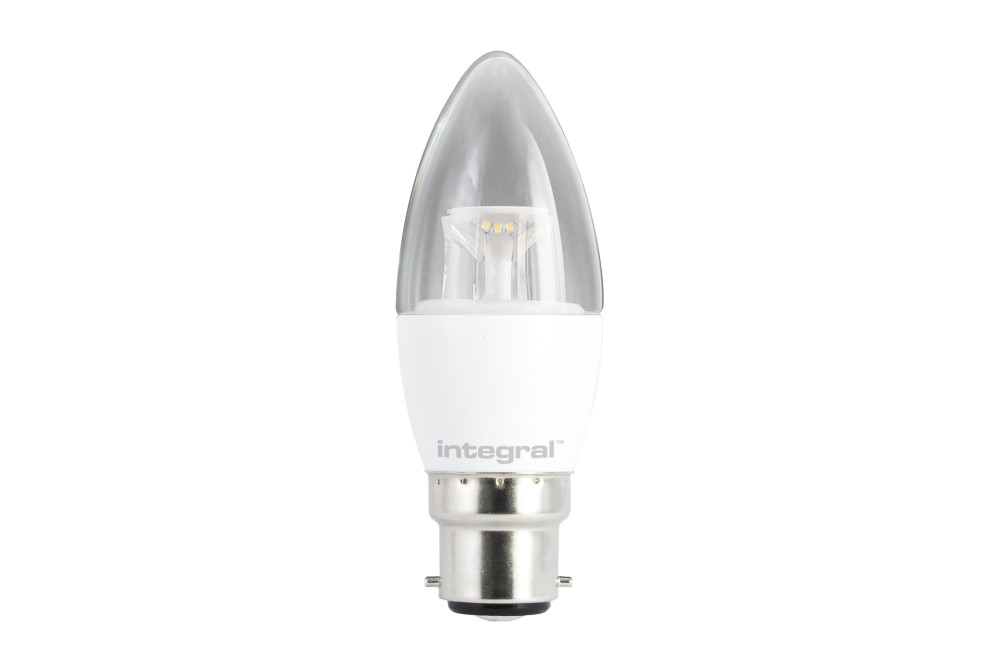 This 5.6W retro-fit Integral LED Candle (clear finish, large bayonet, white base) delivers a dimmable, cool white light and brightness, similar to a 42W filament bulb. It features high output LEDs and an anti-glare refractor. Ideal for living rooms, dining rooms, bedrooms and hotels, in classic or modern wall or floor/table lamp fittings and chandeliers.