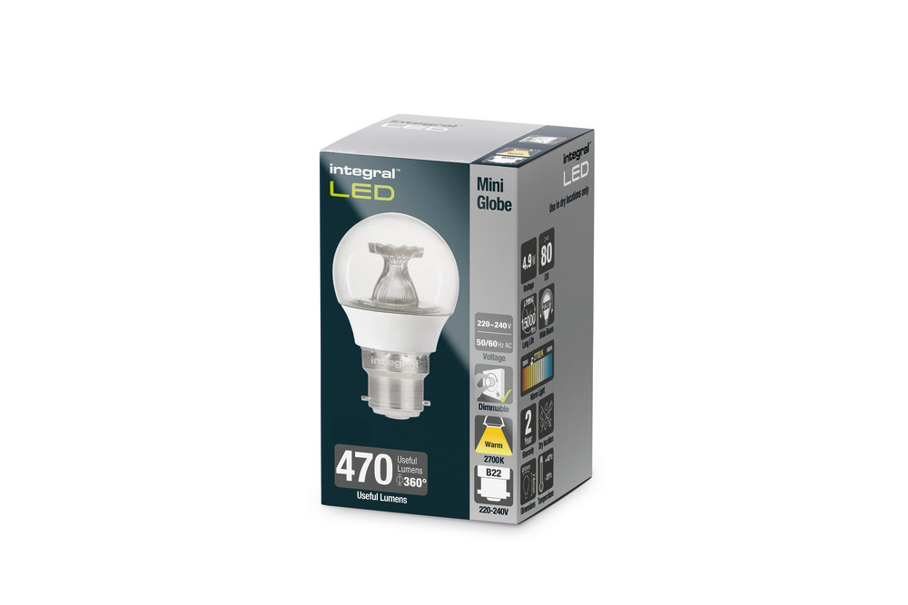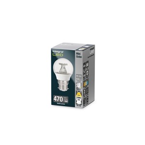 This 4.9W retro-fit Integral LED Mini Globe (large bayonet base) delivers a warm light and brightness, similar to a 40W filament bulb. It features high output LEDs and an anti-glare refractor. Ideal for living rooms, dining rooms and bedrooms, in classic or modern wall or floor/table lamp fittings.