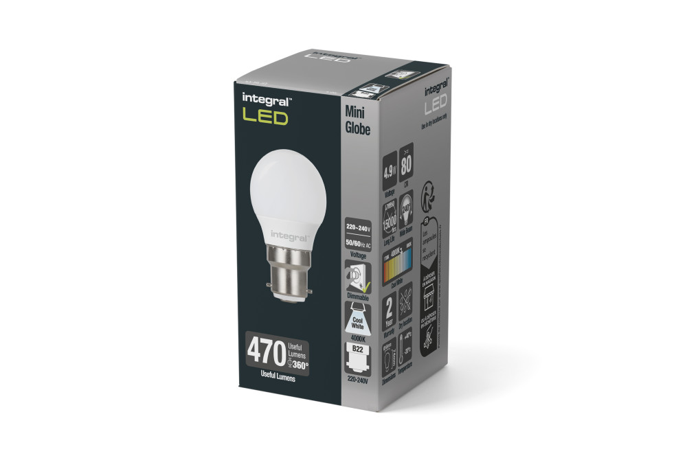 This 4.9W retro-fit Integral LED Mini Globe (large bayonet base) delivers a warm light and brightness, similar to a 40W filament bulb. It features high output, multi LEDs and an anti-glare refractor. Ideal for living rooms, dining rooms and bedrooms, in classic or modern wall or floor/table lamp fittings.