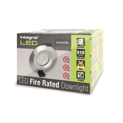 LOW-PROFILE FIRE RATED DOWNLIGHT 70-75MM CUTOUT IP65 510LM 6W 3000K 36 BEAM DIMMABLE 85LM/W SATIN NICKEL INTEGRAL