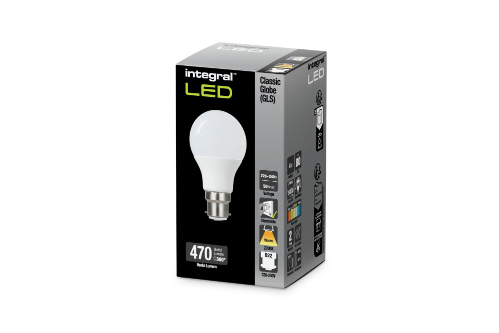 This 4W retro-fit Integral LED Classic Globe (GLS) (large bayonet base) delivers a dimmable, warm light and brightness, similar to a 40W filament bulb. It features high output LEDs and an anti-glare refractor. Ideal for low level light areas such as hallways, bedrooms, cupboards or where light is always on.