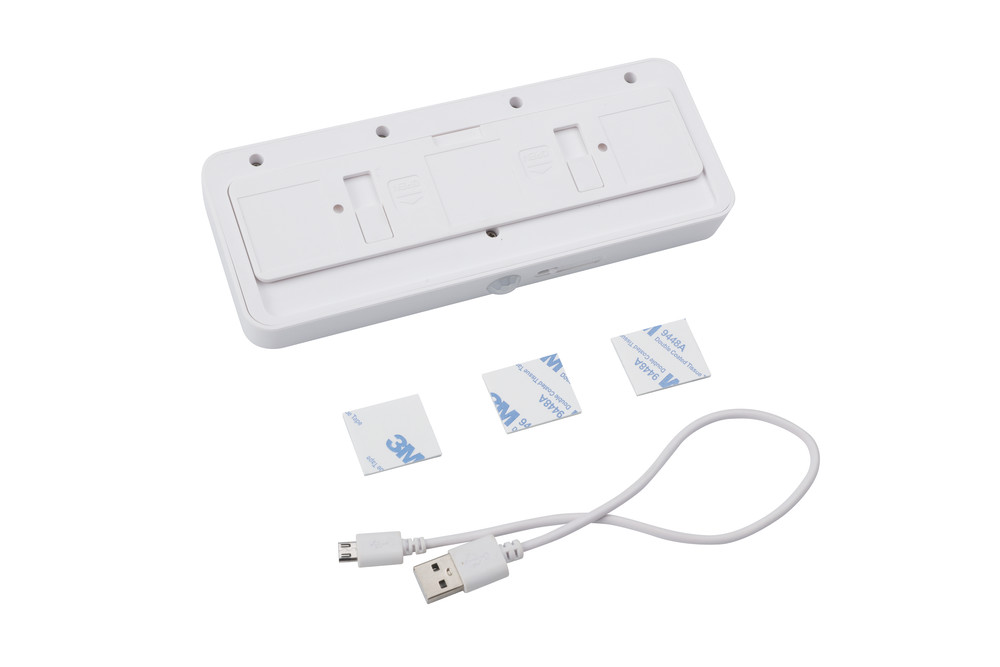A USB rechargeable light ideal for cabinets, wardrobes and other spaces where wiring is inconvenient. The light is easily mounted on the surface with sticky pads. No electrician or tools required!