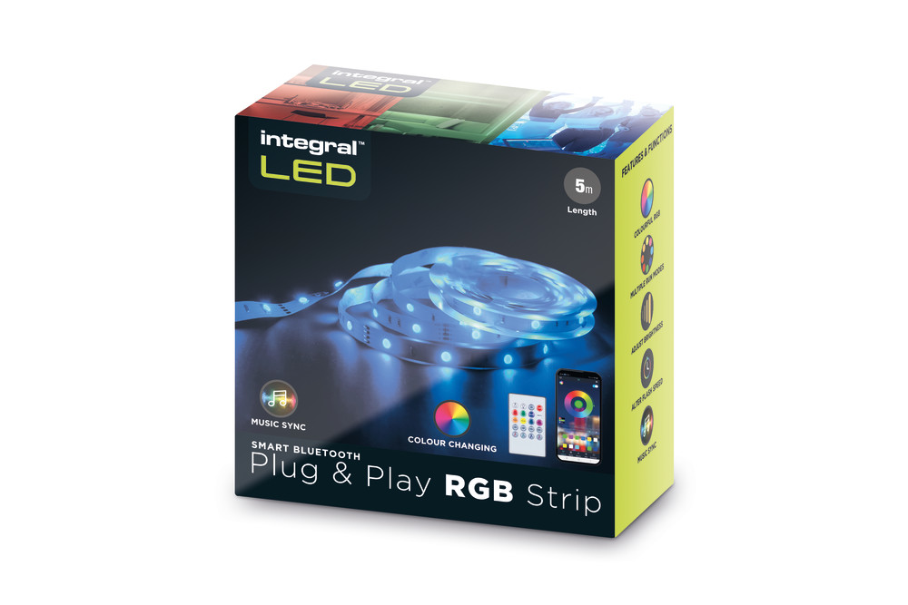 Effortlessly transform you room with Integral LED's Plug and Play Colour Changing Smart Bluetooth Strip Kit. This convenient package comes with 5 metres of strip with clips, a plug adapter and a remote control. It can also be controlled by bluetooth connection using the Ehome app. The ideal smart decorative lighting retail product. Advanced features available when using the app include scheduled on / off, music sync with adjustable sensitivity and multiple extra running modes.