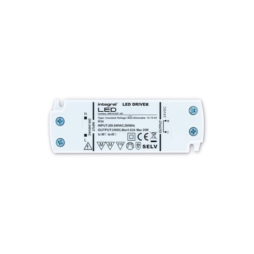 The Integral 15W constant voltage LED driver operates 200-240VAC input range. The LED driver provides 24V constant voltage and up to 0.625A of output current for a 15W maximum output power. Integral LED drivers deliver high reliability and efficiency >= 84% and are fully compatible with 24V constant voltage LED lighting systems. The LED driver features an ultra slim, IP20 rated casing that helps to provide an easy installation and smart finish, ideal for indoor use. Note: Warranty increased to 5 years on 27/03/2025