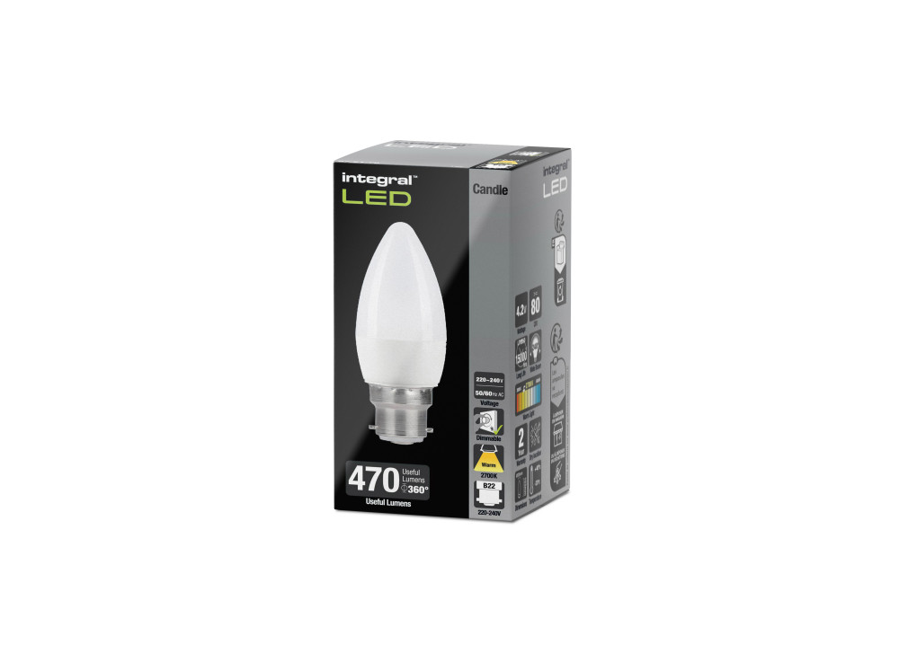 This 4.2W retro-fit Integral LED Candle (frosted finish, large bayonet, white base) delivers a dimmable, warm light and brightness, similar to a 40W filament bulb. It features high output LEDs and an anti-glare refractor. Ideal for living rooms, dining rooms, bedrooms and hotels, in classic or modern wall or floor/table lamp fittings and chandeliers.