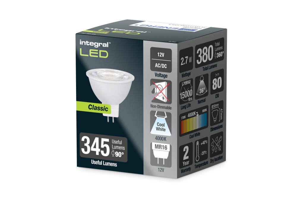 The Integral LED Classic MR16 range offers a fantastic ratio of value and performance. By incorporating a stylish engineered lens in an affordable spotlight, the Classic offers directional light with a beam angle that closely mirrors that of familiar halogen lamps along with all the energy-saving and long-life benefits of LED.