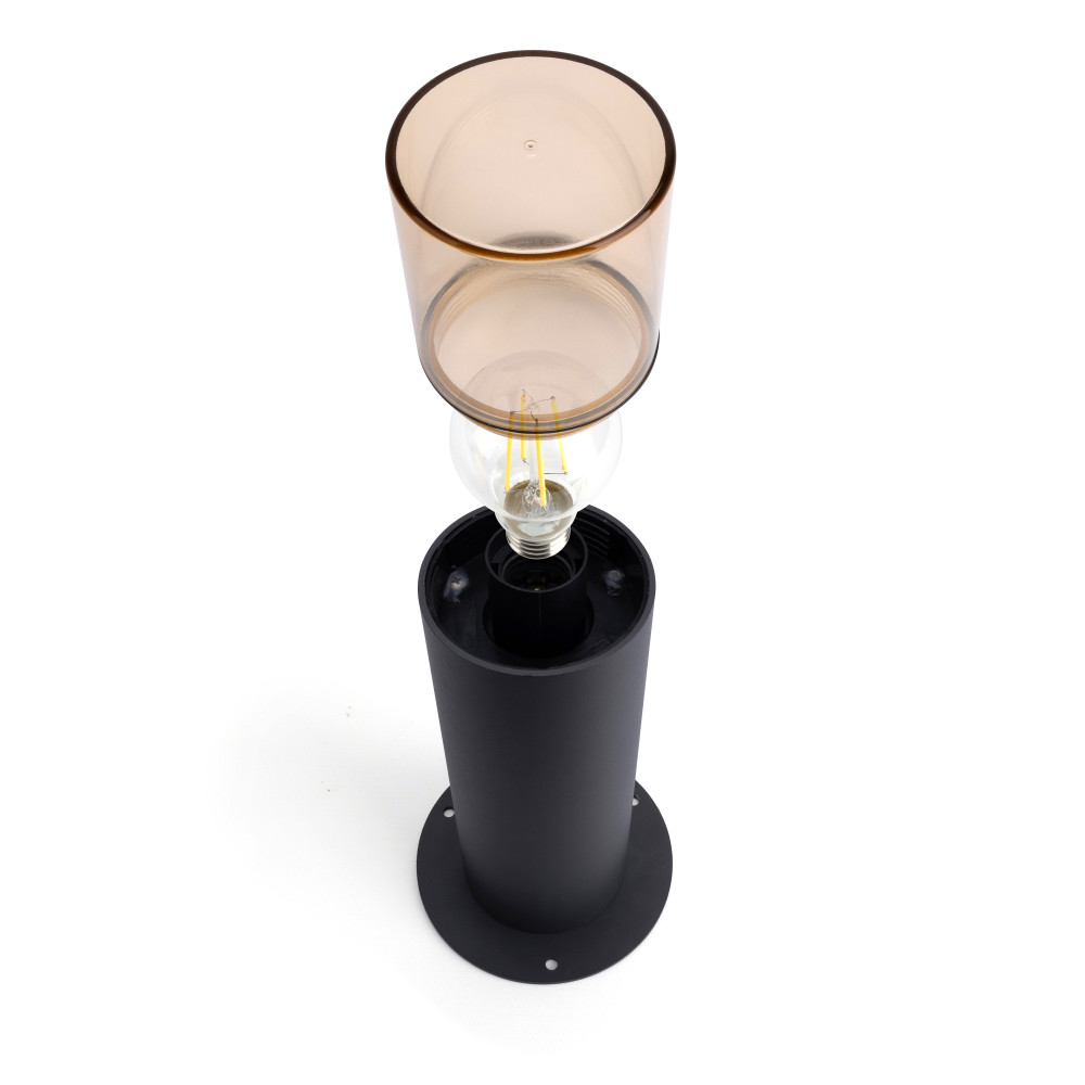 The tinted amber shade, made from durable polycarbonate for safety, emits a warm glow creating a vintage feel and welcoming atmosphere in your garden, pathway, or driveway.