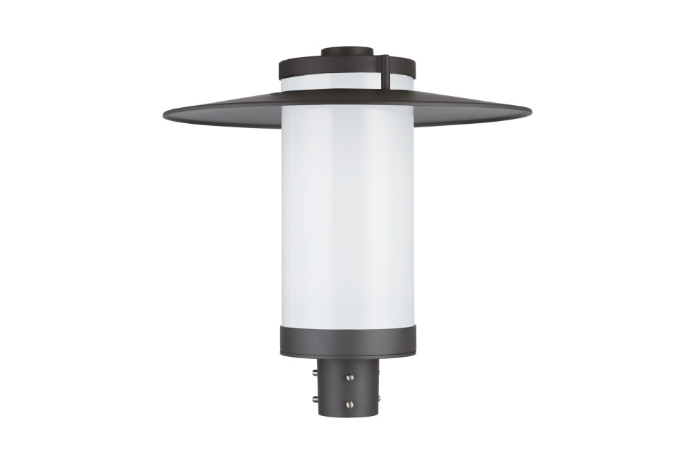 AMENITY POST TOP CANOPY LANTERN 3200LM 45W 4000K IP66 DIFFUSER PC OPAL WITH HOOD 76MM SPIGOT SURGE 10KV NEMA3 SOCKET DUSK-DAWN PHOTOCELL INTEGRAL