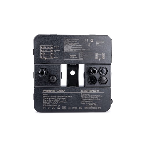 This emergency conversion pack is suitable for Integral LED DOB (driver on board) Highbays up to 200W for use in highbay high-voltage circuits. It provides 3 hours of emergency illumination during a power cut. Simple installation and features include an eco-friendly, long-life LiFePO4 high-capacity battery, short-circuit protection and optional manual-test button.