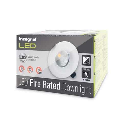 Who says you can't have style without safety? Integral LED Lux Fire downlights not only conform to 30, 60 and 90mins fire rating specifications but are also rated to IP65, so they can be used safely in bathrooms. Lux Fire fire-rated downlights have been tailored to deliver a premium finish to any home or business with their low-glare, high-quality light and contemporary design that looks impressive in any setting. Lux Fire downlights are built using a deep recessed COB LED light source, providing a beam that has softened edges for a luxurious effect. Supplied with a white scalloped metal bezel (interchangeable). Easy to install with low-profile body. Complete with Loop-in / Loop-out driver. IP65 and Air tightness compliant with Part C and Part L. Resistance to Sound compliant with Part E.