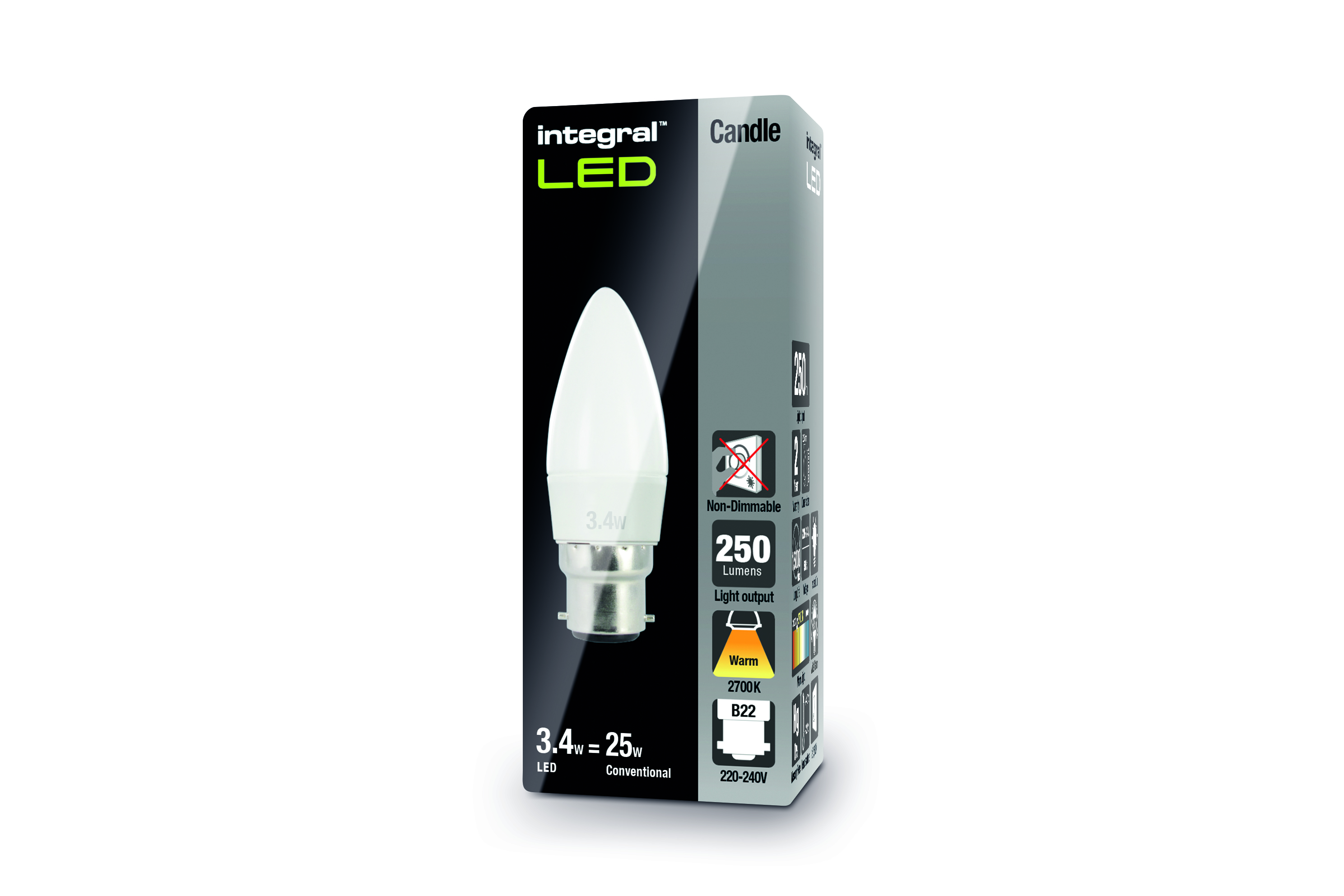 This 3.4W retro-fit Integral LED Candle (frosted finish, large bayonet, white base) delivers a warm light and brightness, similar to a 25W filament bulb. It features high output LEDs and an anti-glare refractor. Ideal for living rooms, dining rooms, bedrooms and hotels, in classic or modern wall or floor/table lamp fittings and chandeliers.
