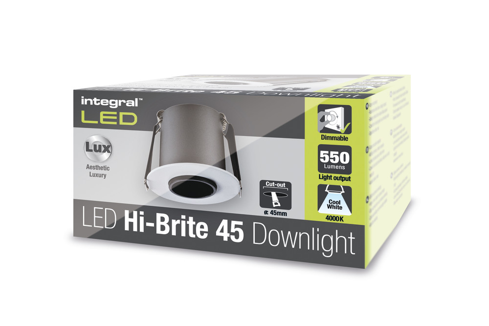HI-BRITE DOWNLIGHT 45MM CUTOUT 9W 550LM 63LM/W 4000K 30 BEAM DIMMABLE FINISH WHITE INTEGRAL