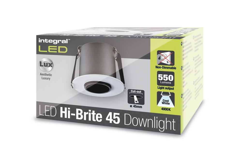 HI-BRITE DOWNLIGHT 45MM CUTOUT 9W 550LM 63LM/W 4000K 30 BEAM NON-DIMM FINISH WHITE INTEGRAL