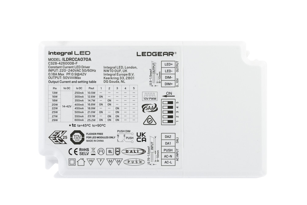 CONSTANT CURRENT DRIVER ADJUSTABLE OUTPUT 13-29W 250-600MA IP20 DALI- DALI2 - PUSH-DIMM 0-10V DIMMABLE 14-42V OUTPUT INTEGRAL