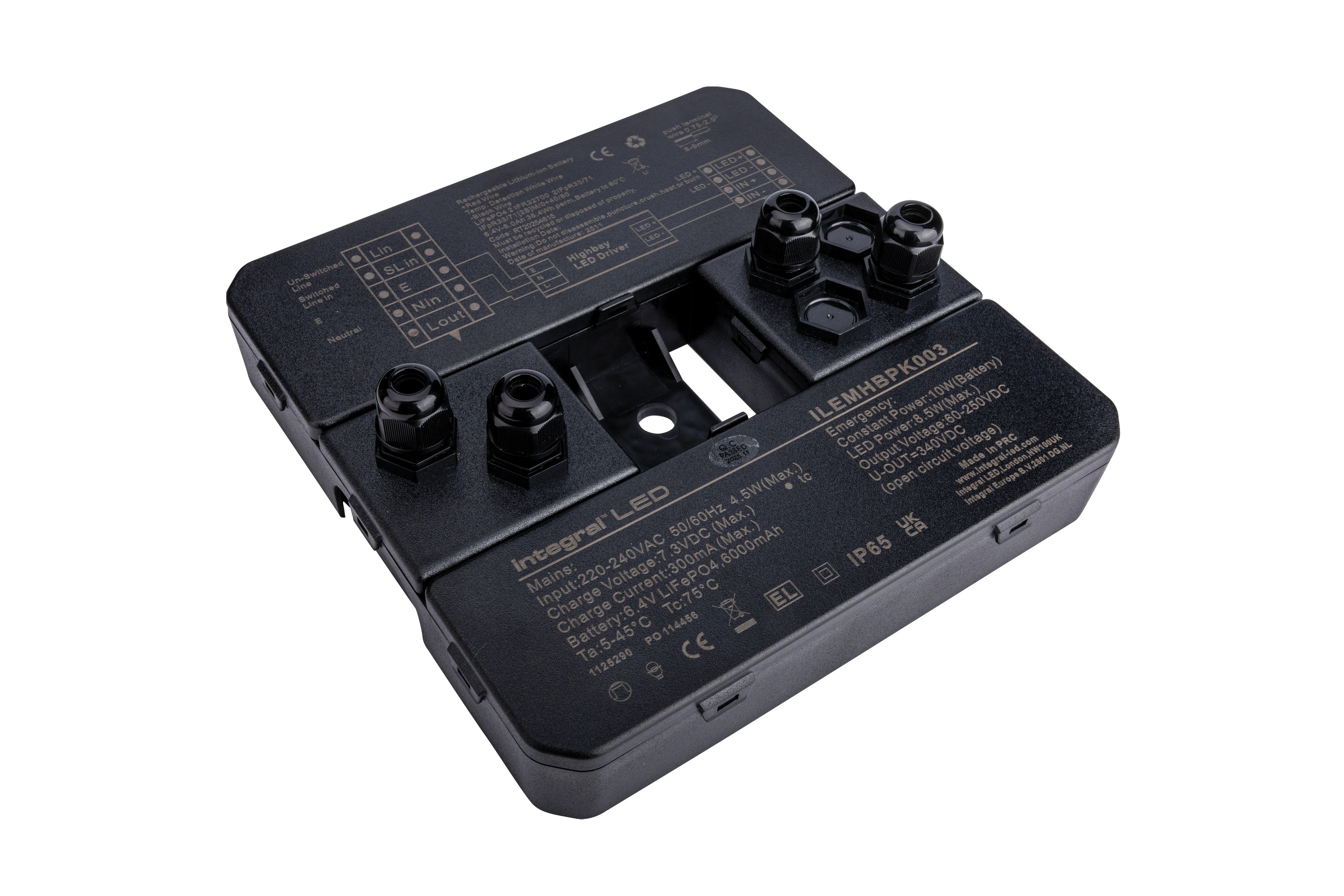 This emergency conversion pack is suitable for Integral LED remote LED driver and detachable LED board Highbays up to 200W. It provides 3 hours of emergency illumination during a power cut and compatible with dimmable and non-dimmable constant current drivers. Simple installation and features include an eco-friendly, long-life LiFeP04 high-capacity battery, short-circuit protection and optional manual-test button.