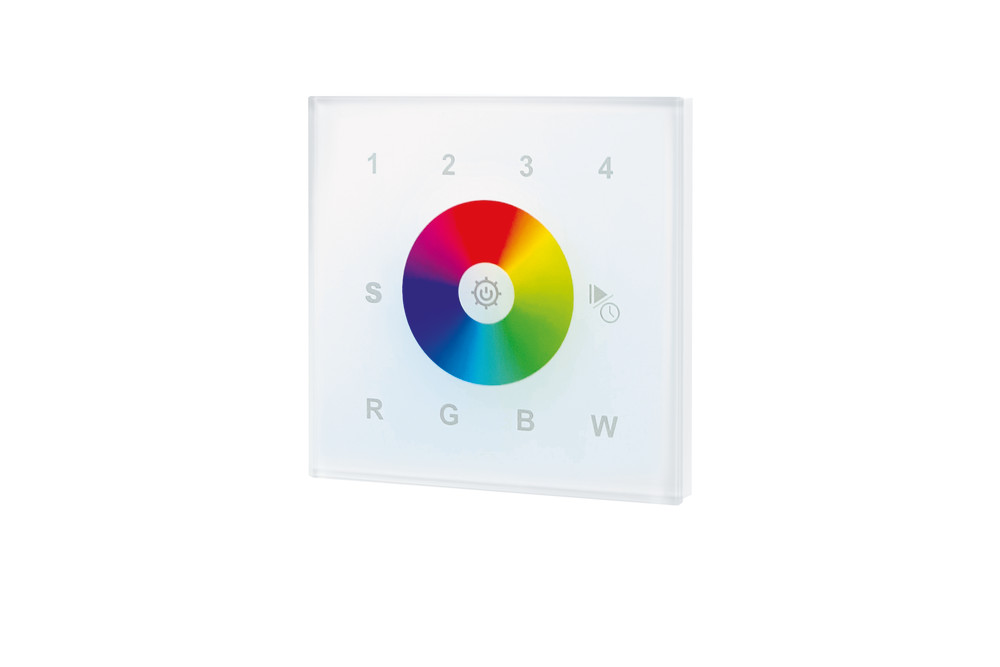 Control a rainbow of colour with the tip of your finger. This Wall-mounted DMX Touch Remote gives you precise and intuitive control over up to four separate areas of RGB/W LED Strip. Set and save features allow you to save multiple lighting settings for each area so you can set your favourite ambience quickly and easily.