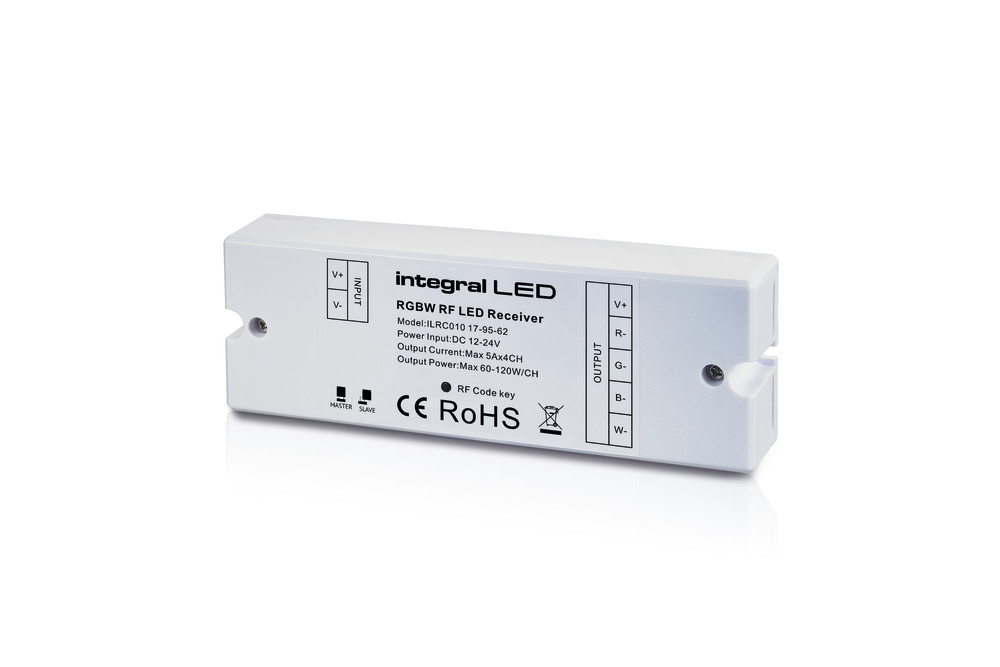 This RGBW colour RF (Radio Frequency) receiver and touch/button remote control can be used with Integral RGBW colour changing strips. With the RGBW colour changing remote control, you can easily change the strip colour by choosing the colour area on the central touch circle or pressing the mode button for 10 colour modes, control the brightness and change the speed when choosing the dynamic light mode. You can also control the RGB chip and White chip individually by pressing the R, G, B and White buttons to create your colour preference.