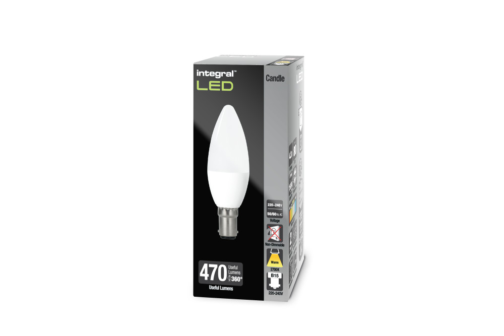 This 4.2 W retro-fit Integral LED Candle (frosted finish, small bayonet, white base]) delivers a warm light and brightness, similar to a 40W filament bulb. It features high output LEDs and an anti-glare refractor. Ideal for living rooms, dining rooms, bedrooms and hotels, in classic or modern wall or floor/table lamp fittings and chandeliers.