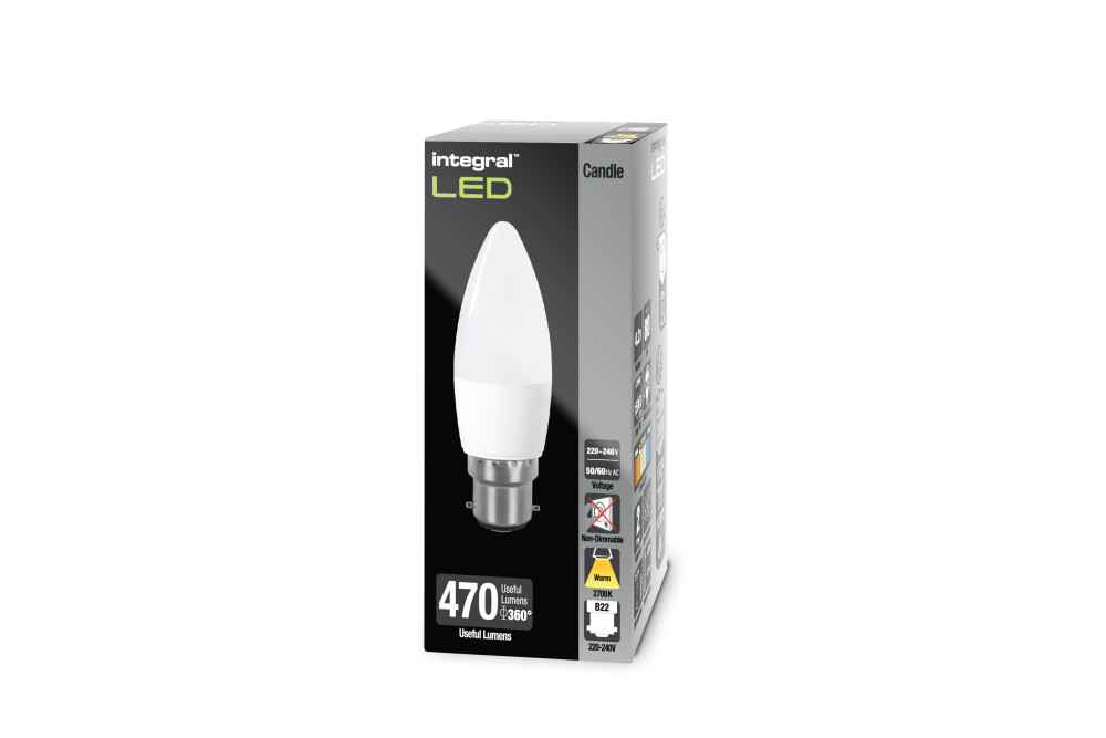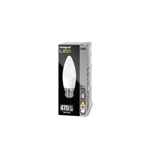 This 4.2W retro-fit Integral LED Candle (frosted finish, large bayonet, white base) delivers a warm light and brightness, similar to a 40W filament bulb. It features high output LEDs and an anti-glare refractor. Ideal for living rooms, dining rooms, bedrooms and hotels, in classic or modern wall or floor/table lamp fittings and chandeliers.
