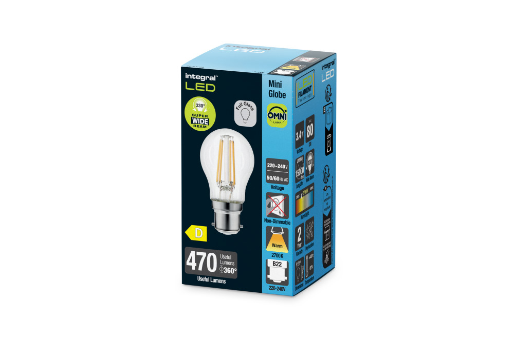 OMNI FILAMENT GOLF BALL BULB B22 470LM 3.4W 2700K NON-DIMM 330 BEAM CLEAR FULL GLASS INTEGRAL