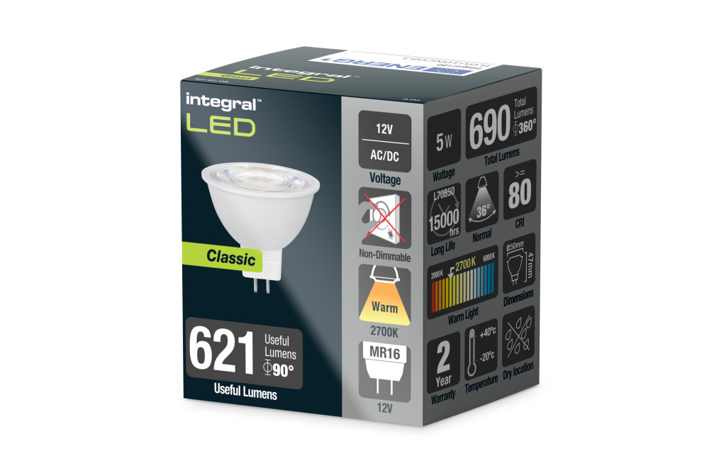 The Integral LED Classic MR16 range offers a fantastic ratio of value and performance. By incorporating a stylish engineered lens in an affordable spotlight, the Classic offers directional light with a beam angle that closely mirrors that of familiar halogen lamps along with all the energy-saving and long-life benefits of LED.
