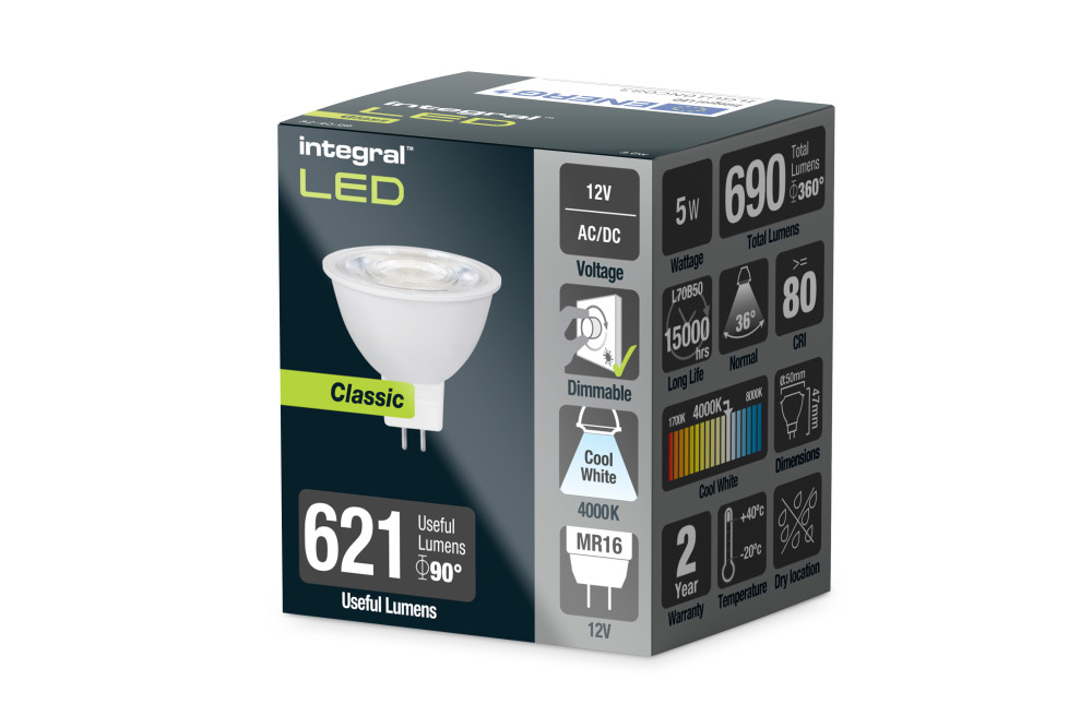 The Integral LED Classic MR16 range offers a fantastic ratio of value and performance. By incorporating a stylish engineered lens in an affordable spotlight, the Classic offers directional light with a beam angle that closely mirrors that of familiar halogen lamps along with all the energy-saving and long-life benefits of LED.