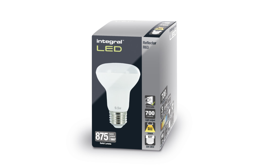 This 9.5W retrofit Integral LED R63 delivers brightness similar to a 54W incandescent bulb. It is dimmable, with a warm white light. It features a 700 lumen output, multi LEDs and an anti-glare refractor. Ideal for living rooms, dining rooms, bathroom and bedrooms, in classic or modern wall lamp fittings.
