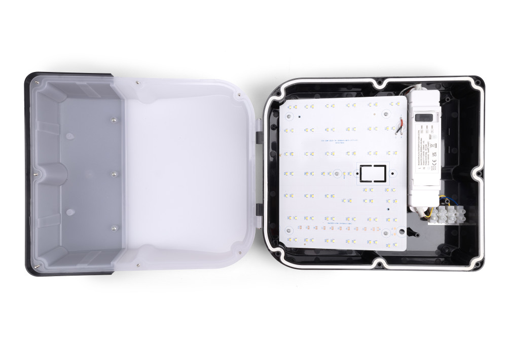 The luminaire features a polycarbonate body that provides IK10 and IP65 protection, making it robust enough for the most demanding installations. Suitable for both indoor and outdoor settings, it offers switchable CCT options of 3000K, 4000K, and 6000K, as well as adjustable power settings to meet various application requirements.